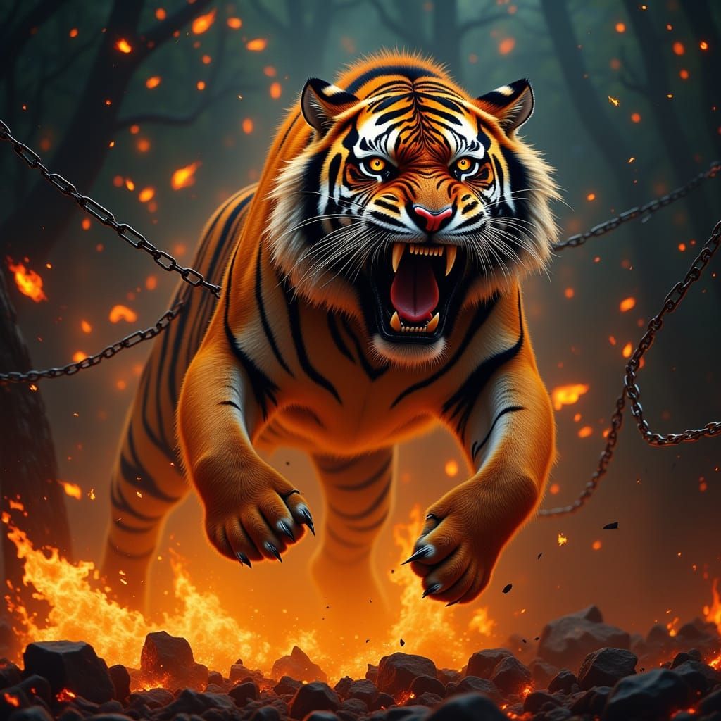 This image shows a powerful tiger leaping aggressively through the air, shattering heavy iron chains amidst intense, fiery explosions at night. Photorealistic style with dramatic cinematic lighting.
