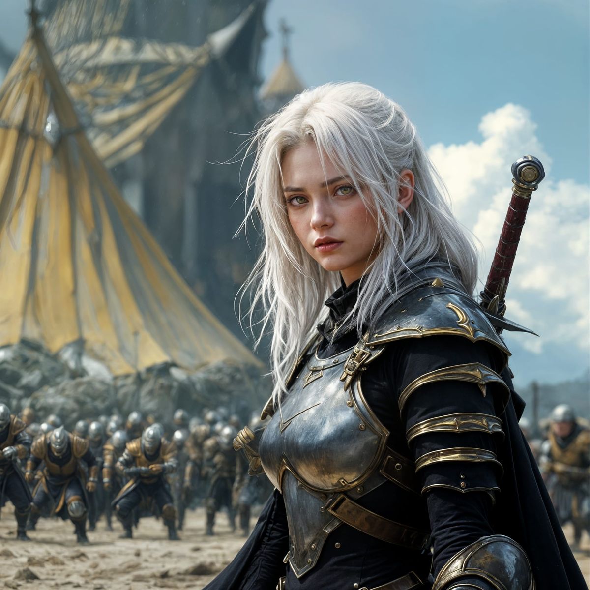 This image shows a tired, young female knight with white hair and golden eyes in an orc encampment. Sheathed sword at her back. The artwork has a fantasy anime aesthetic.