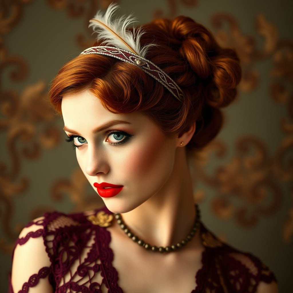 A portrait of a cancan dancer reminiscent of the 1920s. The woman has striking features and is adorned in wine-colored lace. The image is in the style of Art Nouveau.