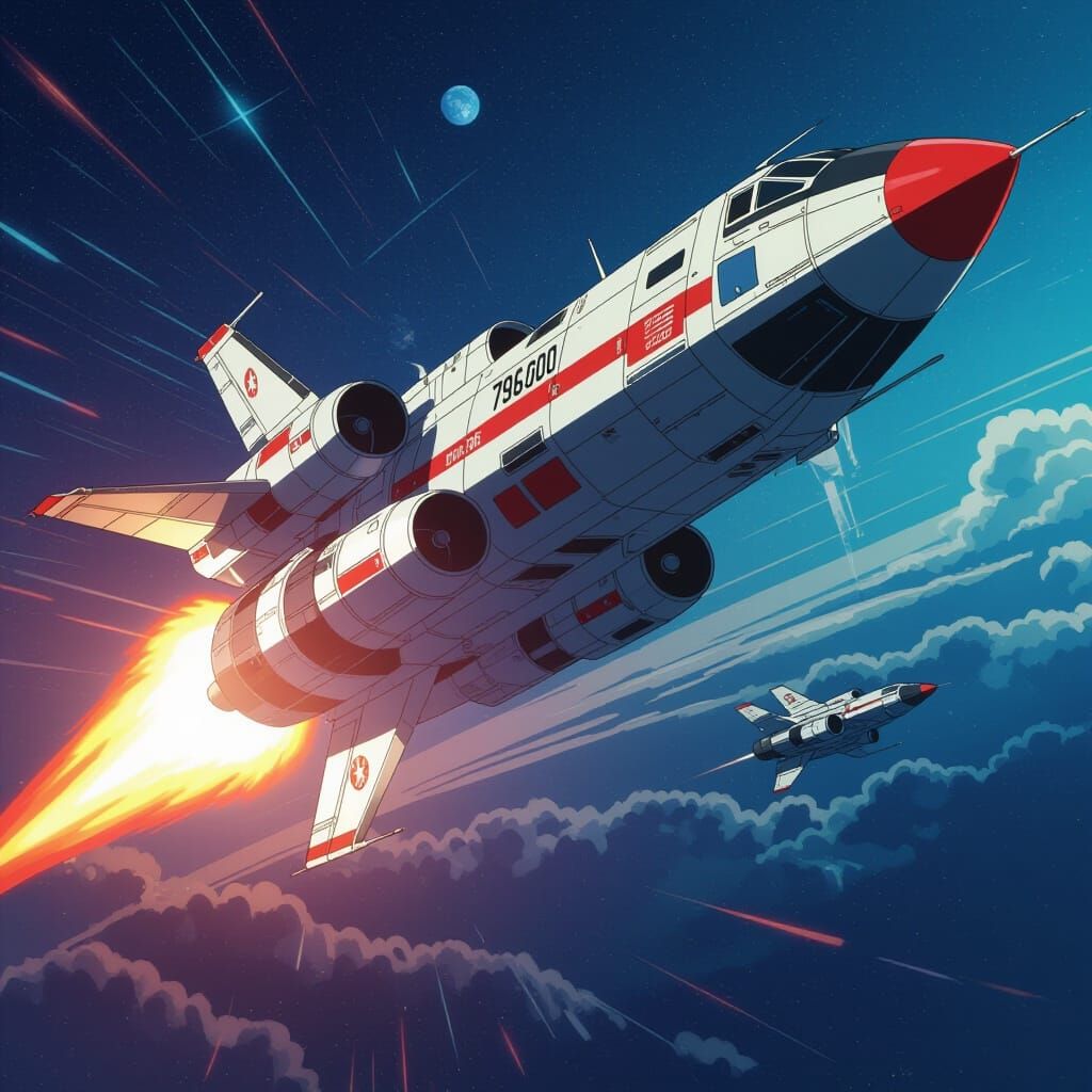 This image depicts a massive spacecraft inspired by 1960s Apollo designs, updated with a late 1980s anime aesthetic. It features vibrant colors, dynamic lines, and dramatic lighting for a retro-futuristic feel.