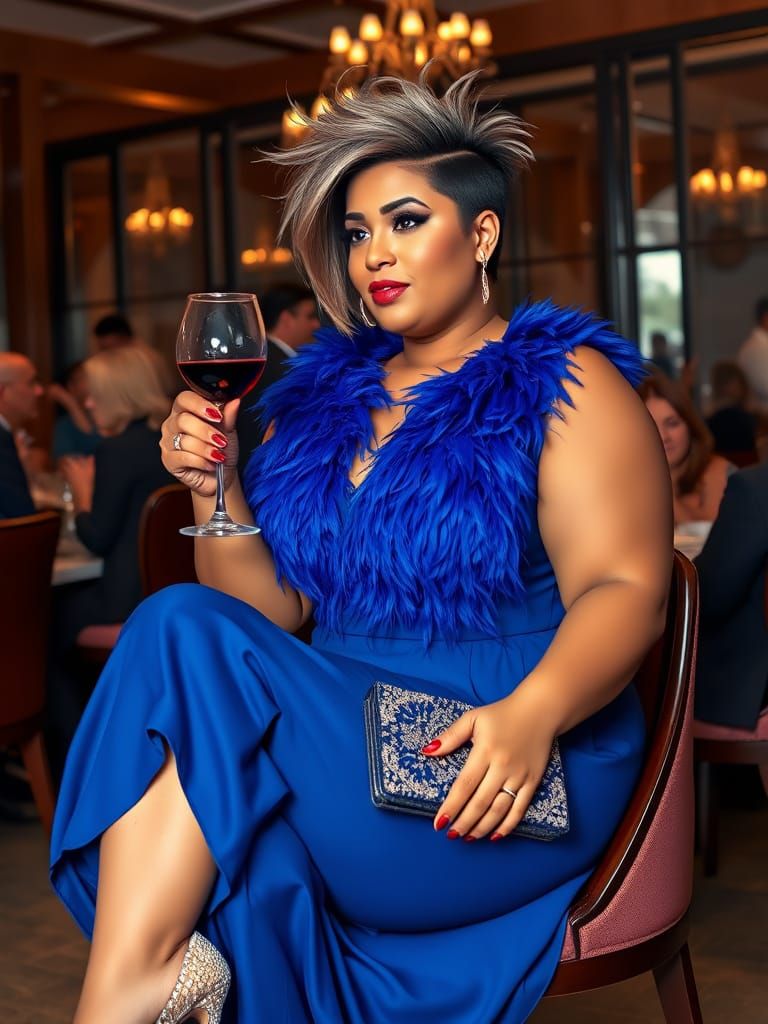 This image depicts a confident plus-size woman, exuding poise and elegance, in a stunning royal blue outfit, surrounded by refined patrons in a sophisticated restaurant setting.