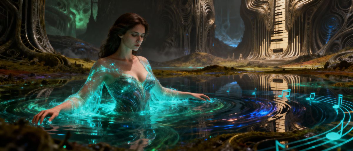 This image shows a serene woman illuminated by bioluminescence within a surreal landscape that visualizes deep human emotions and the flow of music. Rendered in a hyperrealistic, cinematic 3D style with ethereal lighting.