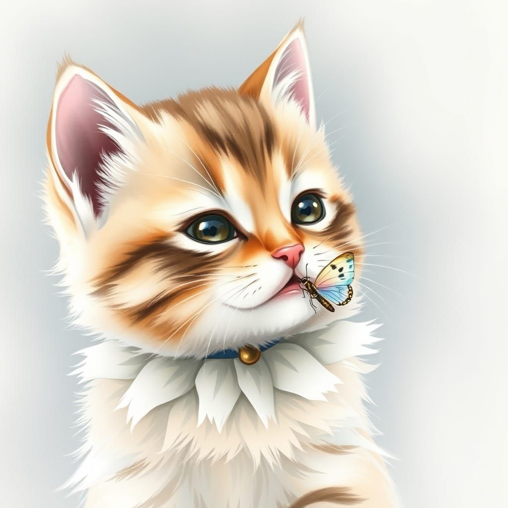This charming image shows a kitten with a fluffy collar, as a pastel-colored butterfly gently alights on its nose, in a delicate watercolor aesthetic reminiscent of classic children's book illustrations.