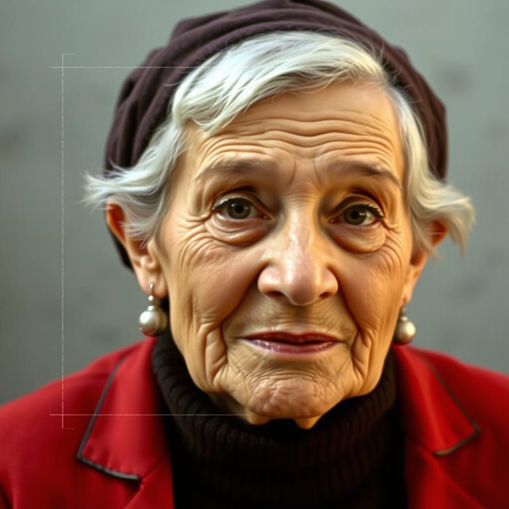 This image shows a heavily pixelated portrait of an old woman. The image has been digitally distorted, with some pixels' colors inverted, creating a broken effect.