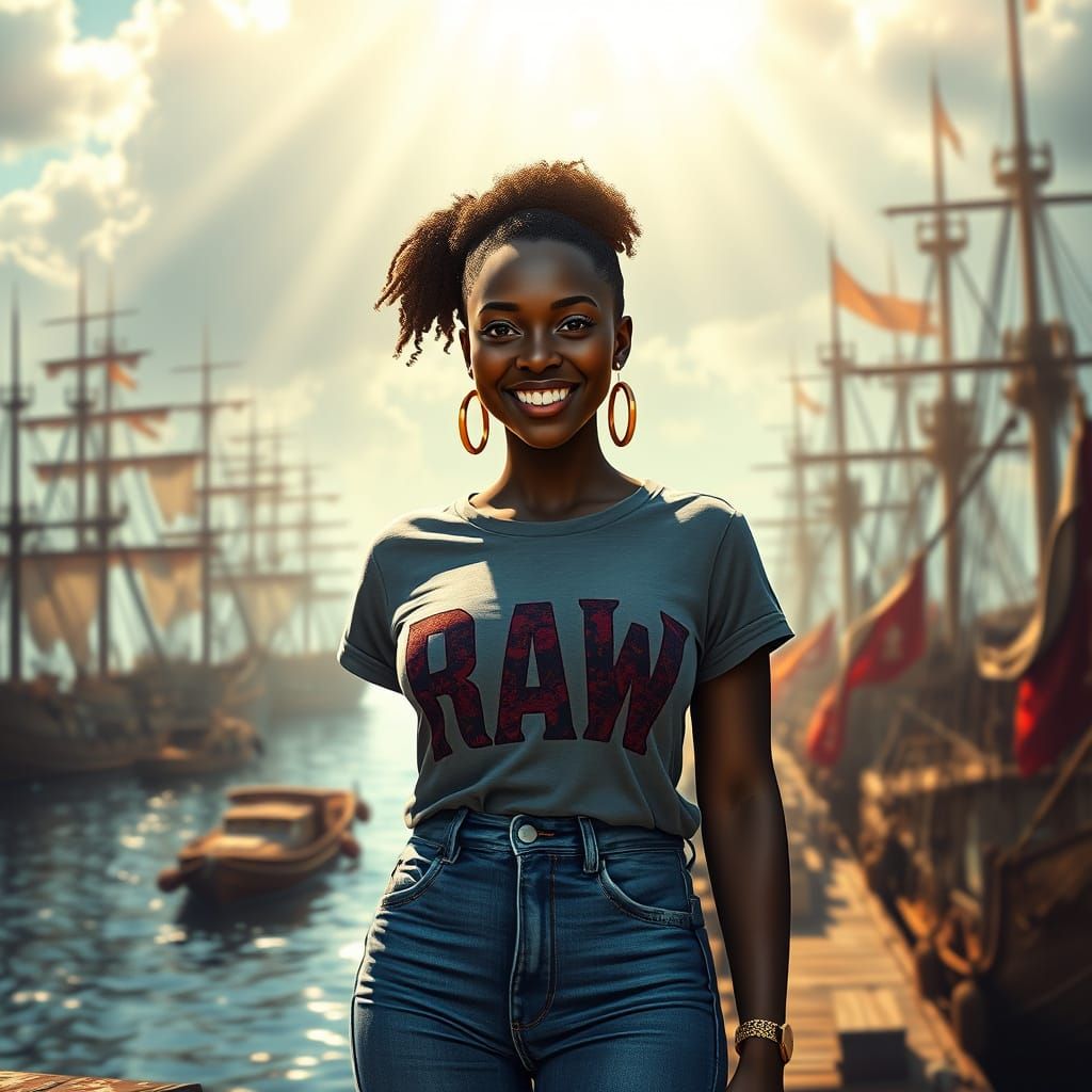 A digital art image of a smiling Black woman in jeans and a t-shirt with "RAW" in gothic letters, standing in a busy port with pirate ships, bathed in golden sunlight.