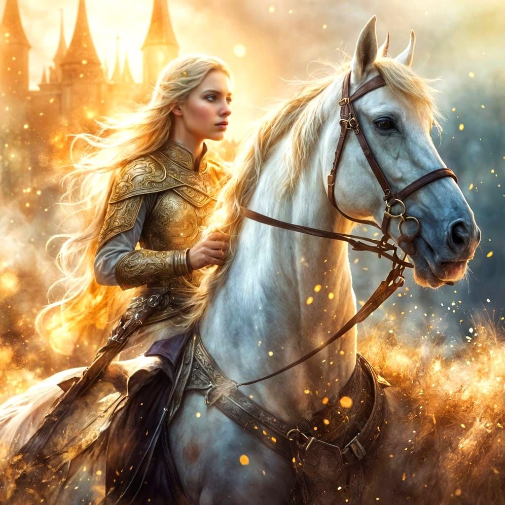 This image depicts a regal princess sitting atop a majestic horse on a windy hill, overlooking a small village kingdom in the golden hour light, with warm and cool complementary colors blending together in a watercolor-inspired 3D concept art piece.