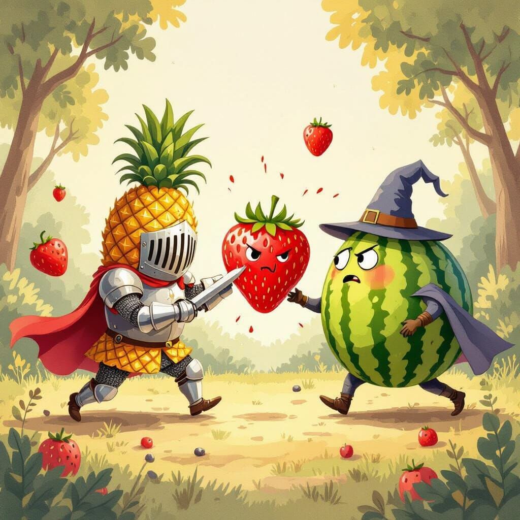 This image depicts anthropomorphic fruits in a playful, low-stakes battle over a giant strawberry, inspired by vintage storybook illustrations and comic art. Features a pineapple knight and watermelon mage.