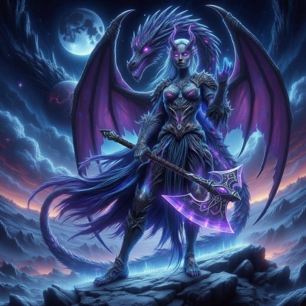 This image shows a half-human, half-dragon female warrior in cyberpunk armor. She watches her army march past on a snowy hill under two moons and a distant galaxy. The image has a dark, ominous aesthetic.