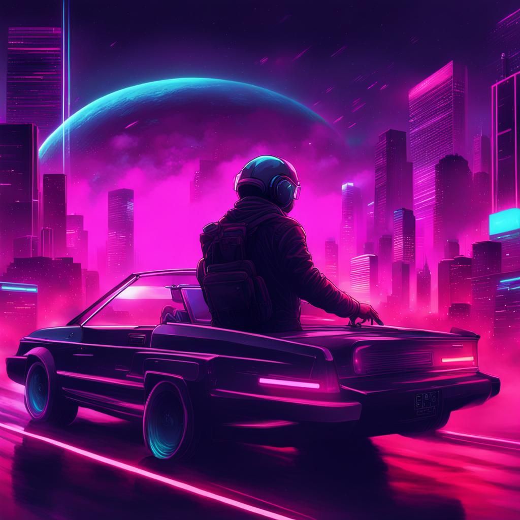 This image captures a cinematic synthwave style with a futuristic cityscape. Dominated by neon colors, it features a cyborg-human figure and a sleek car in an upbeat, electronic composition.