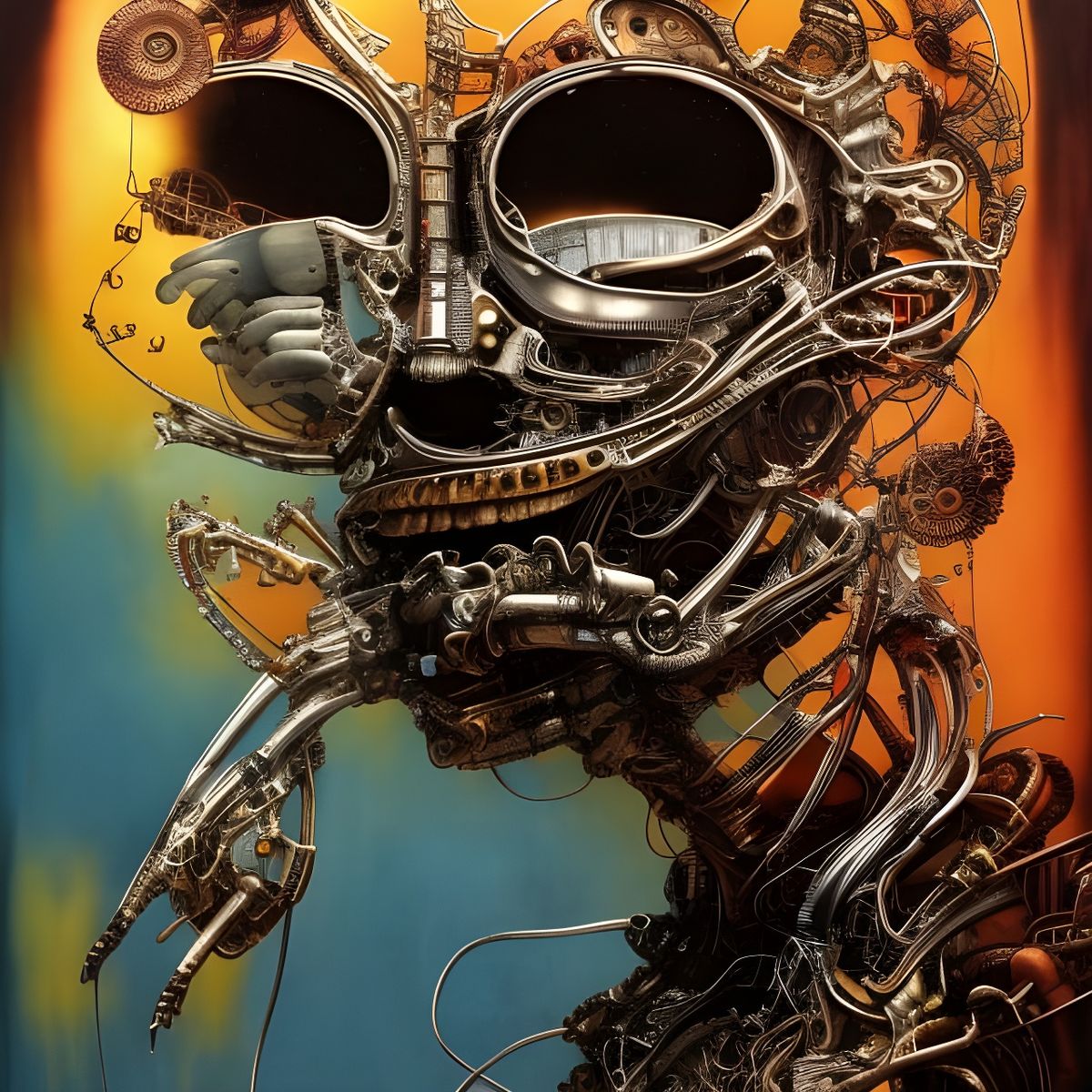 This image shows a biomechanical Pac-Man with cybernetic implants and fractal wiring. The figure is expressively rendered in deep, regal colors with photorealistic detail.