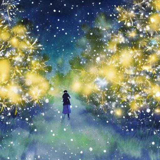 A vibrant watercolor image reminiscent of anime, featuring a person in the moonlight. Sparkling snowflakes and glowing mist add to the scene's intricate details and soft, natural light.
