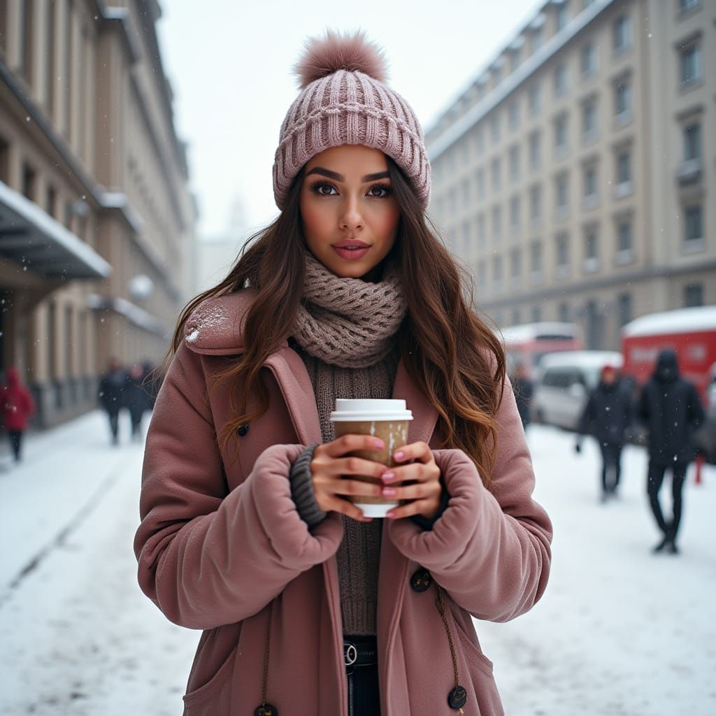 This image shows a pop star in a winter wonderland setting, surrounded by brutalist architecture and enjoying a warm cup of coffee in the snow-covered streets of Katowice, with a mix of digital painting and photorealistic elements.