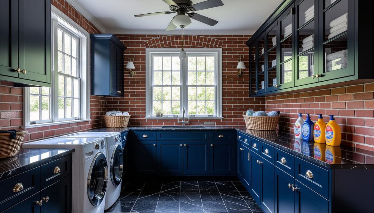 This image showcases a clean and tidy Victorian laundry room featuring dark blue cabinets, glass windows, and charming brick wallpaper. A washing machine and dryer are visible on the black marble floor.