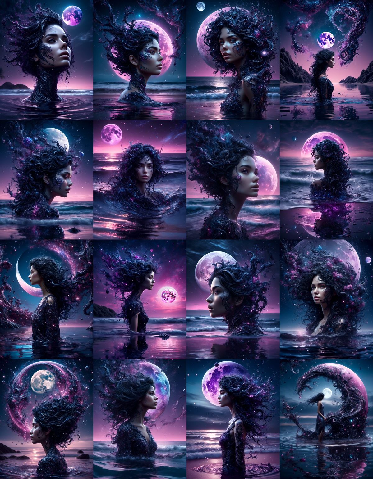 This image shows a girl with dark hair reflected in the ocean under a violet moon. The scene is rich in detail, with a moody, cinematic atmosphere enhanced by blue, pink, black, and white tones.