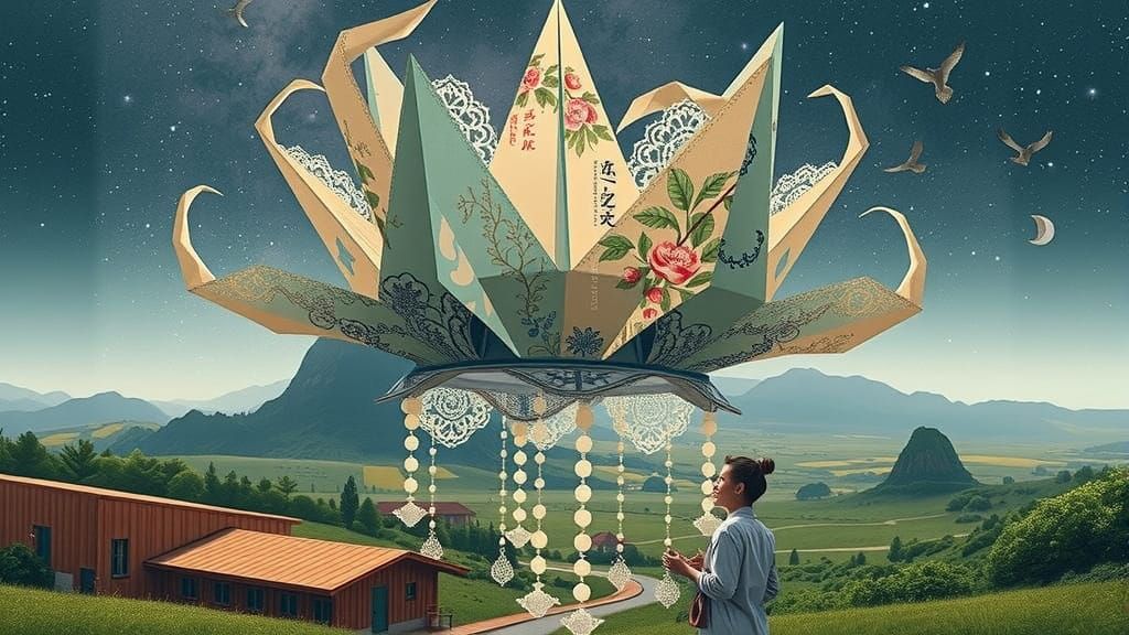 A delicate, lace-like origami sculpture, suspended in mid-air, with intricate details and soft focus, evoking the tactile quality of paper, reminiscent of dreamlike scenes and traditional Japanese woodblock prints.