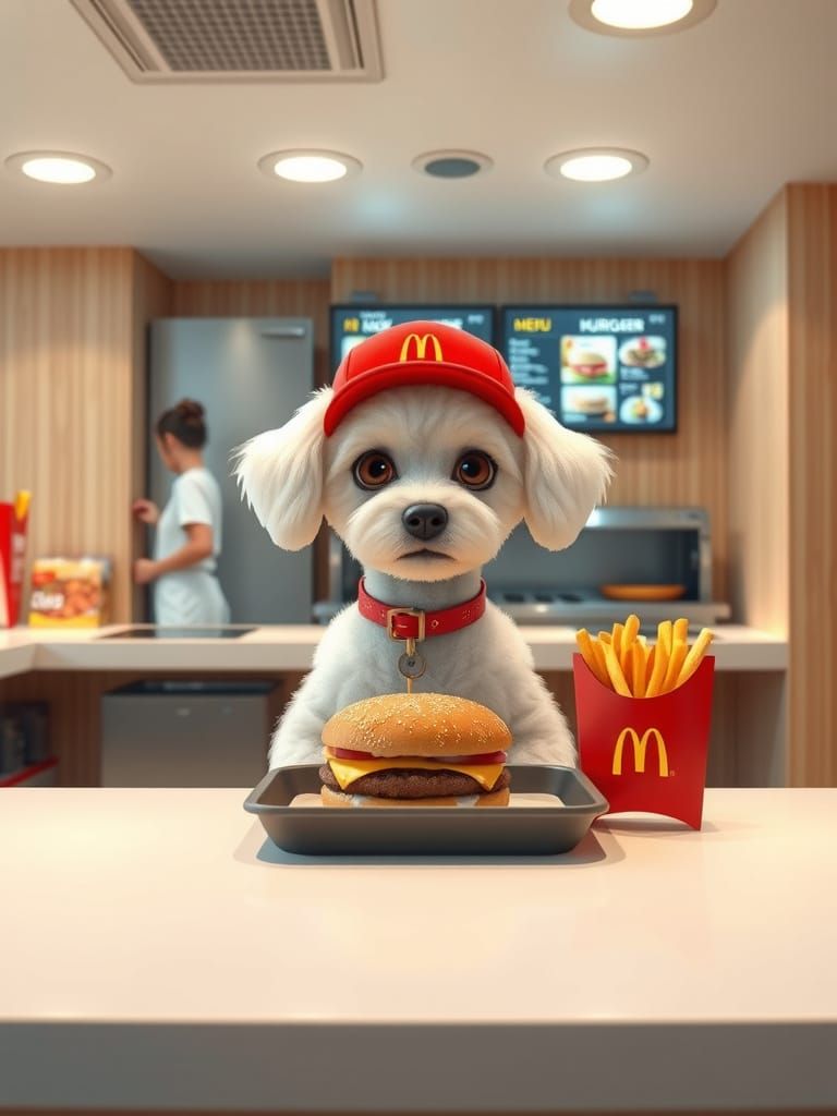 This image shows a modern McDonald's restaurant with a white poodle standing behind the counter, wearing a bright red hat. The interior design features soft pastel colors and kid-friendly details, creating a welcoming atmosphere.