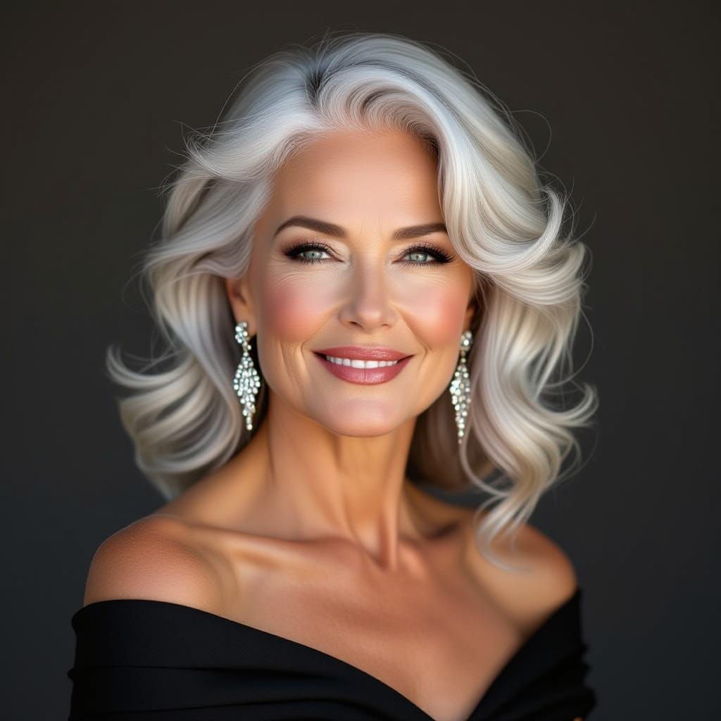 This image is a vibrant portrait of a mature woman with silver hair styled in loose waves, adorned with sparkly jewelry, and a subtle smile, evoking the dramatic flair of Art Deco and the delicate details of early 20th-century poster art