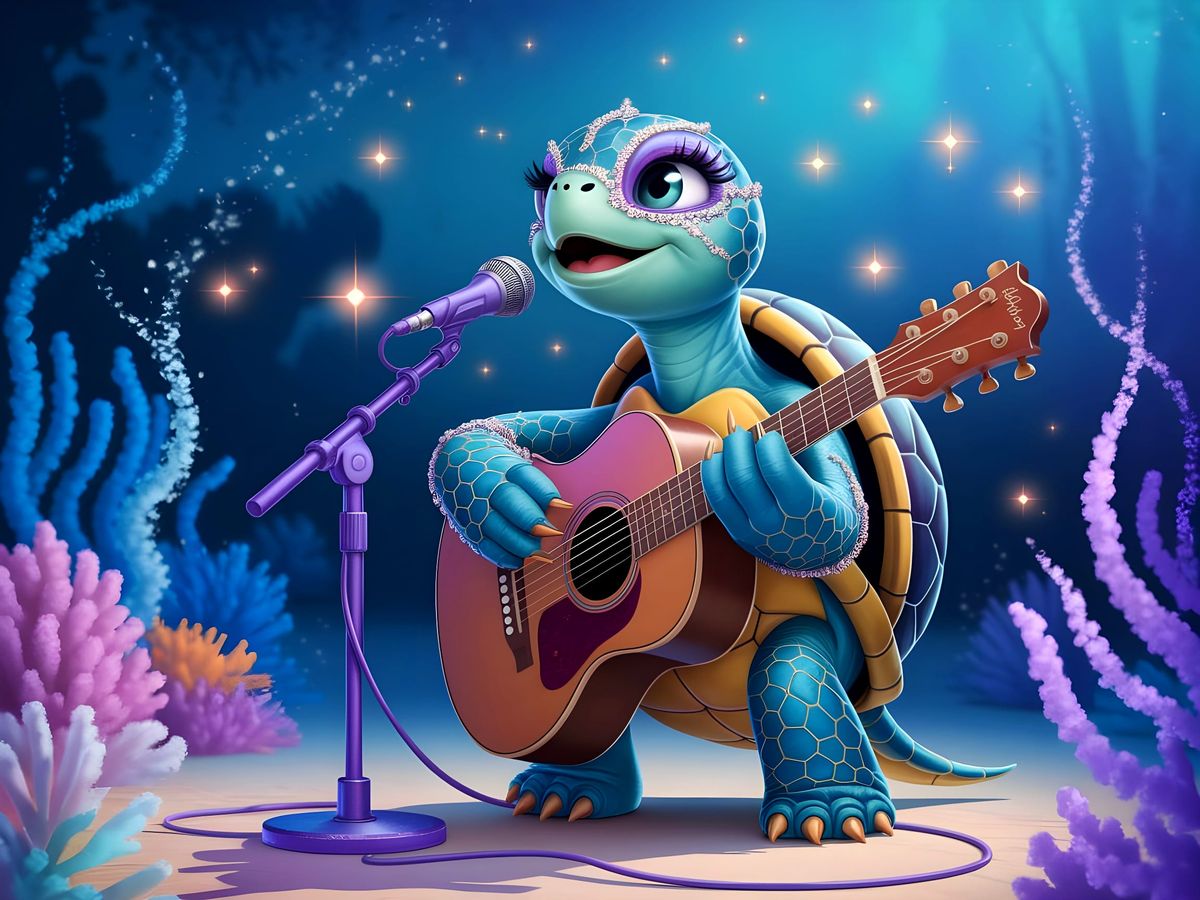 A whimsical turtle, adorned with fantasy embellishments, strums a guitar and sings into a microphone. The underwater scene glows with soft, warm hues and mesmerizing aquatic life.