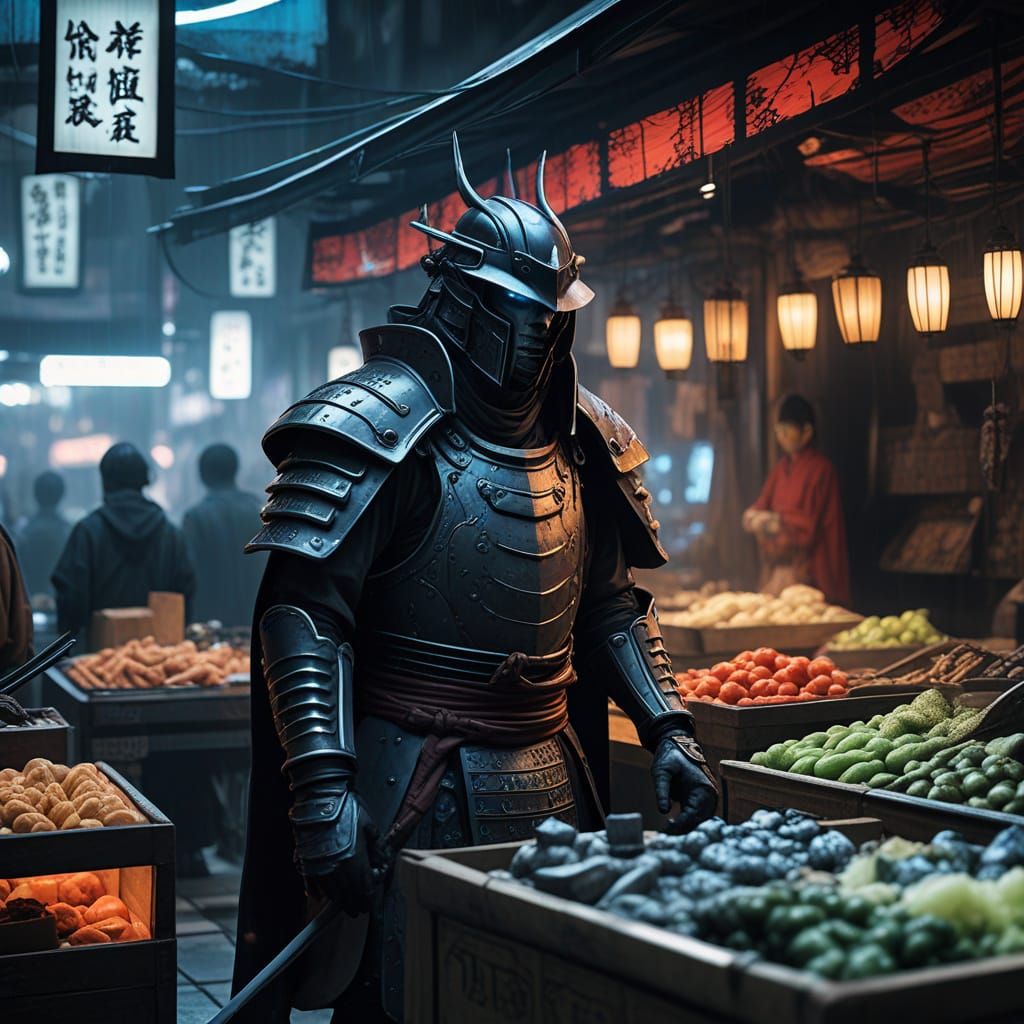 A striking picture of a gothic samurai warrior in dark steel armor examining alien artifacts at a market. The image is rendered in a traditional Japanese ink wash painting style with neon light accents.