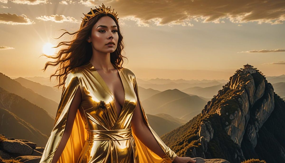 A stunning cinematic film still of a latex-clad sun goddess standing atop a mountain peak, bathed in warm golden light with subtle lens flare and film grain, evoking a sense of drama and majesty.
