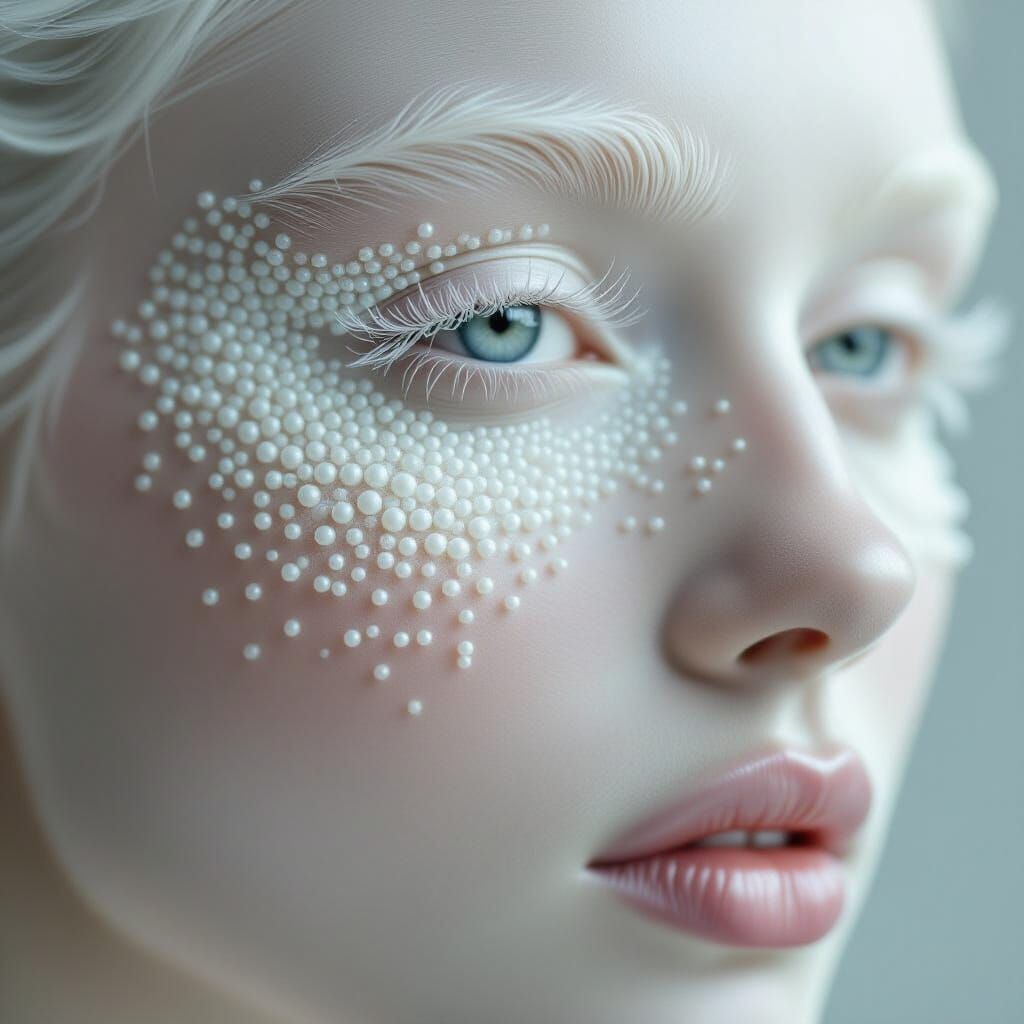 This image presents an extreme close-up of an albino woman's face, featuring a powdery white complexion and delicate seed pearls artfully placed on her eyelids. Captured in a stark studio setting with cinematic lighting, it highlights fragile, soft beauty.