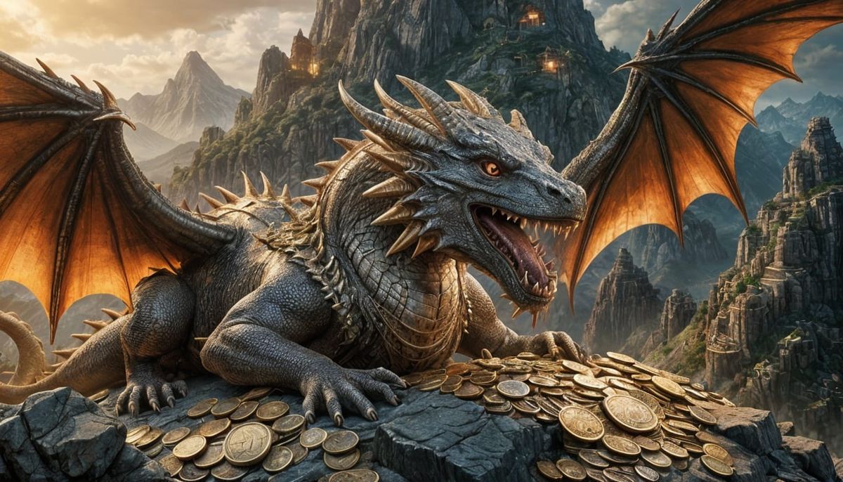 A majestic dragon rests atop a hoard of gold and gems. This digital matte painting features dramatic, atmospheric lighting and meticulous detail in an epic, maximalist style.