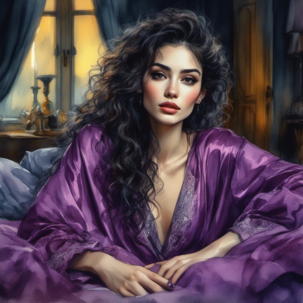 This image shows a beautiful gothic woman with dark curly hair, relaxing in bed. The artwork features a watercolor sketch style with photorealistic elements, rendered in violet pastel tones.