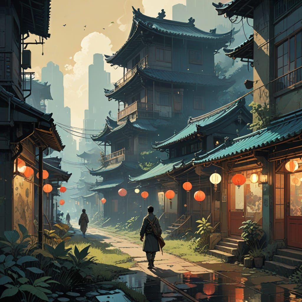 This image is a stylized depiction of a neon-lit Japanese street scene, blending elements of traditional architecture with a futuristic aesthetic reminiscent of classic sci-fi illustrations.