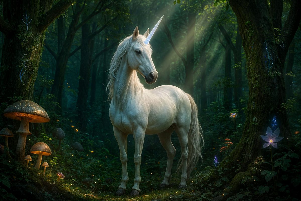 A striking picture of a white unicorn in a magical forest. The hyperrealistic digital artwork features a pearlescent unicorn with a softly glowing horn standing amid glowing flora and fauna.