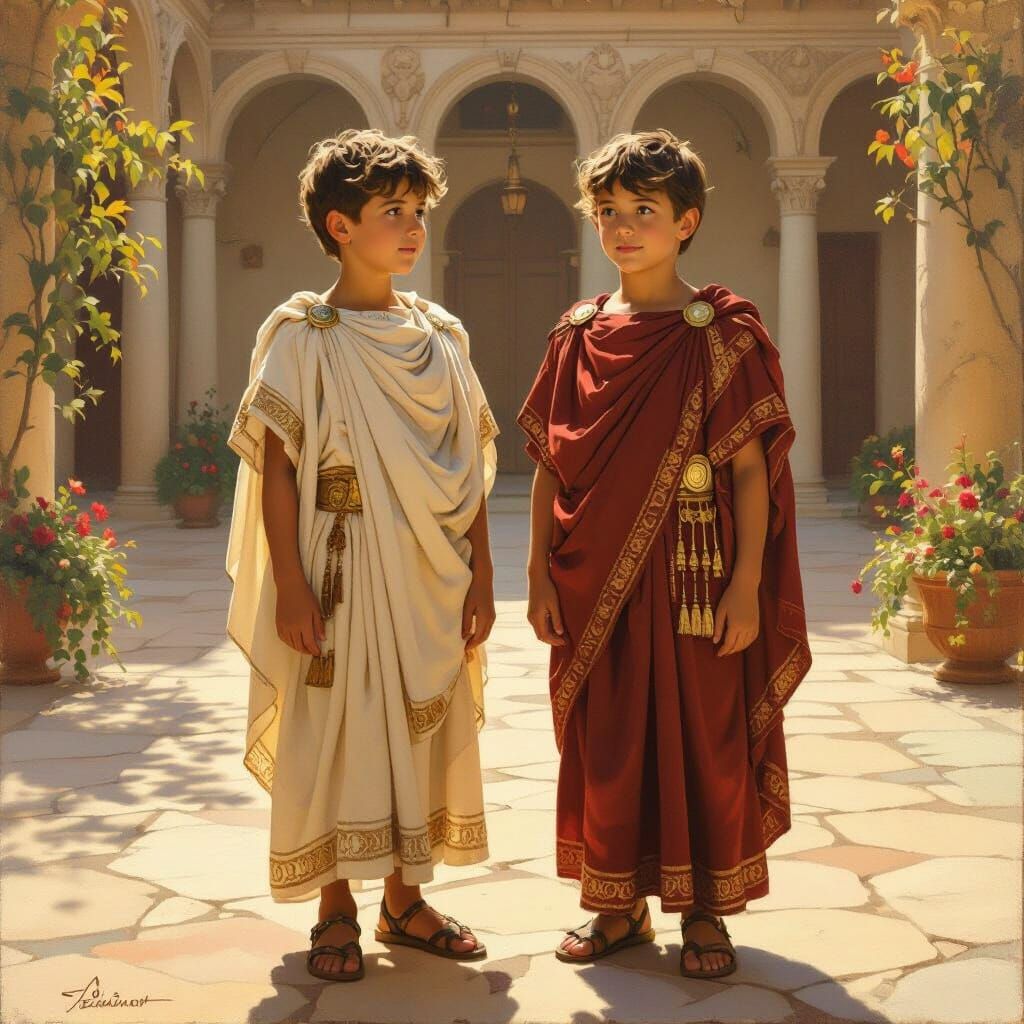This image shows two identical, beautiful Roman twin boys, around twelve years old, dressed in ornate togas. Rendered in a realistic oil painting style with rich textures and warm lighting.