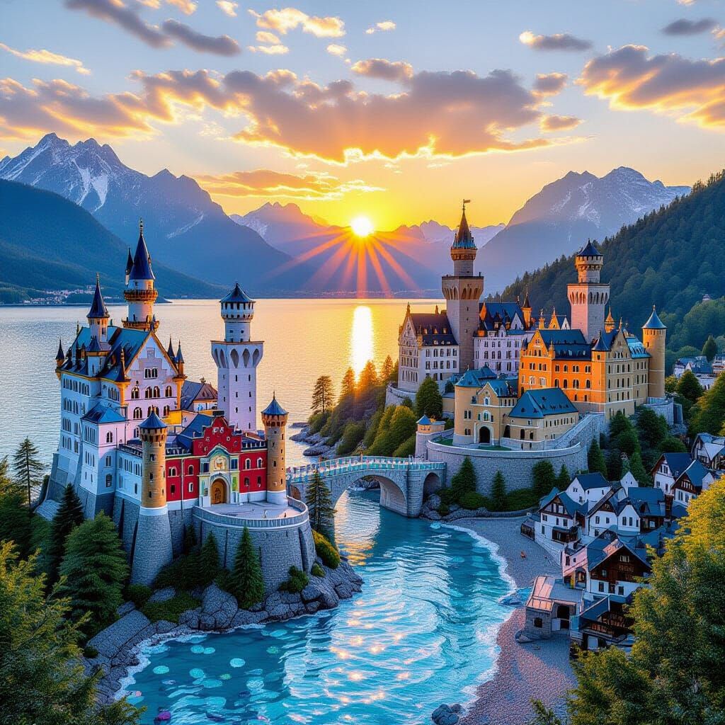 This mosaic image features four iconic castles constructed from vibrant crystal sea glass beads, set against a sunrise mountain and ocean backdrop. Crystal bead villages and bridges add detail. The style is reminiscent of glass art with glowing, translucent elements.