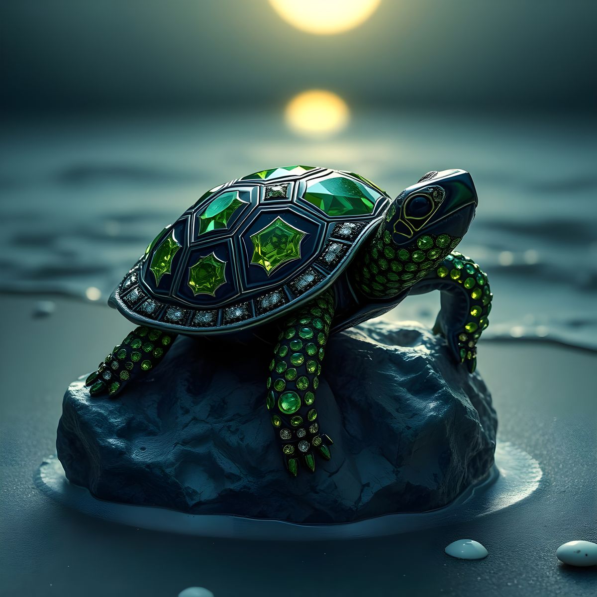 A hyperrealistic sculpture of a majestic turtle made of emeralds and onyx. The turtle rests on a polished rock base in a dark, elegant environment that highlights its jewel-like colors. The image has soft lighting.