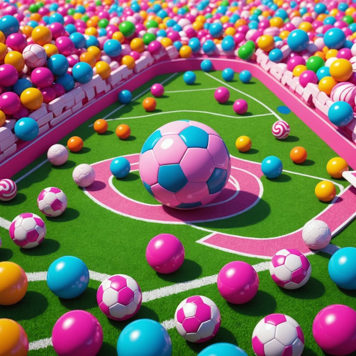 This image shows a whimsical and playful soccer field in pink and green hues. The digital illustration is hyperrealistic and highly detailed, resembling candy art in a postmodern style.
