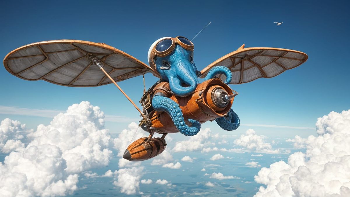 This image shows a wooden ornithopter piloted by an octopus, soaring high in the sky. The intricate flying machine features fabric-covered wings and Renaissance-era mechanics in a da Vinci style.