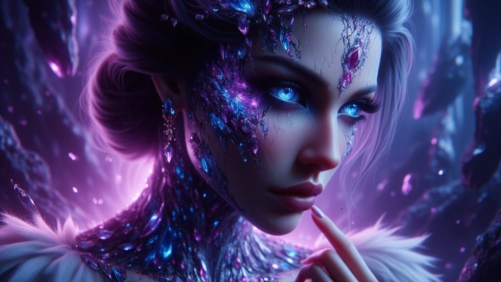 This image shows a regal woman wearing diadems and necklaces crafted from Sovereign Amethyst. It features a striking violet-to-blue gradient, dramatic lighting, and intricate jeweled embellishments in an Art Nouveau fantasy style.