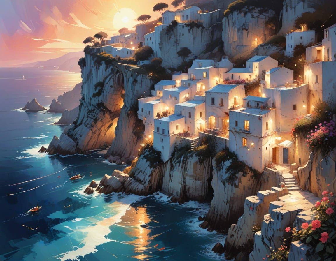 A captivating view of a Mediterranean village nestled on a cliffside. The scene features whitewashed buildings, vibrant flowers, and sapphire-blue waves, rendered with soft, blended brushstrokes in a watercolor style.