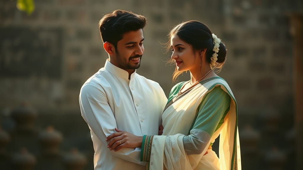 This image shows a young man in traditional Pakistani clothing embracing a woman in a white saree. The soft lighting and warm highlights create a romantic and peaceful mood, reminiscent of classic cinematic portraiture.