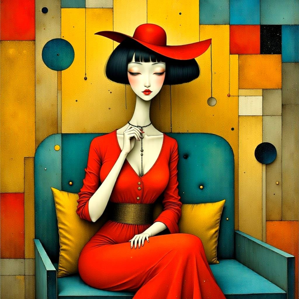 This image depicts a stunning singer in a luxurious, velvet-lined club, surrounded by vibrant colors and an air of surreal happiness, reminiscent of Paul Klee's watercolor style.