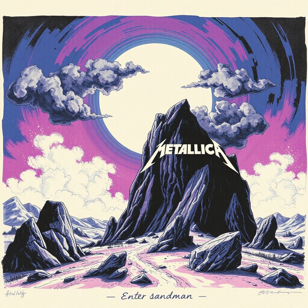 This image combines surreal elements with kinetic typography to evoke the driving rhythm and haunting melody of Metallica's 'Enter Sandman'. A dreamlike landscape with bold lines and textures blends minimalist and abstract styles, echoing the spirit of Saul Bass's iconic title sequences.