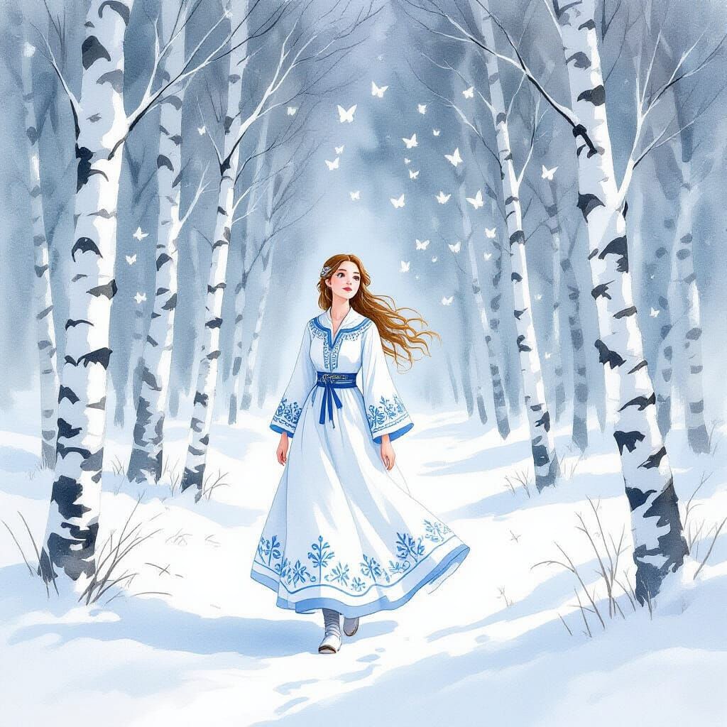 This image shows a figure walking through a birch forest in winter. The scene is rendered in soft watercolor, with traditional Ukrainian elements and a dreamlike atmosphere. The art style evokes feelings of longing and quiet sadness.