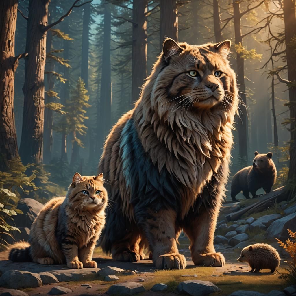This image shows a large fluffy cat staring curiously at a tiny grizzly bear. The scene is rendered with cinematic lighting, vibrant colors, and detailed textures, in a fantasy art style.