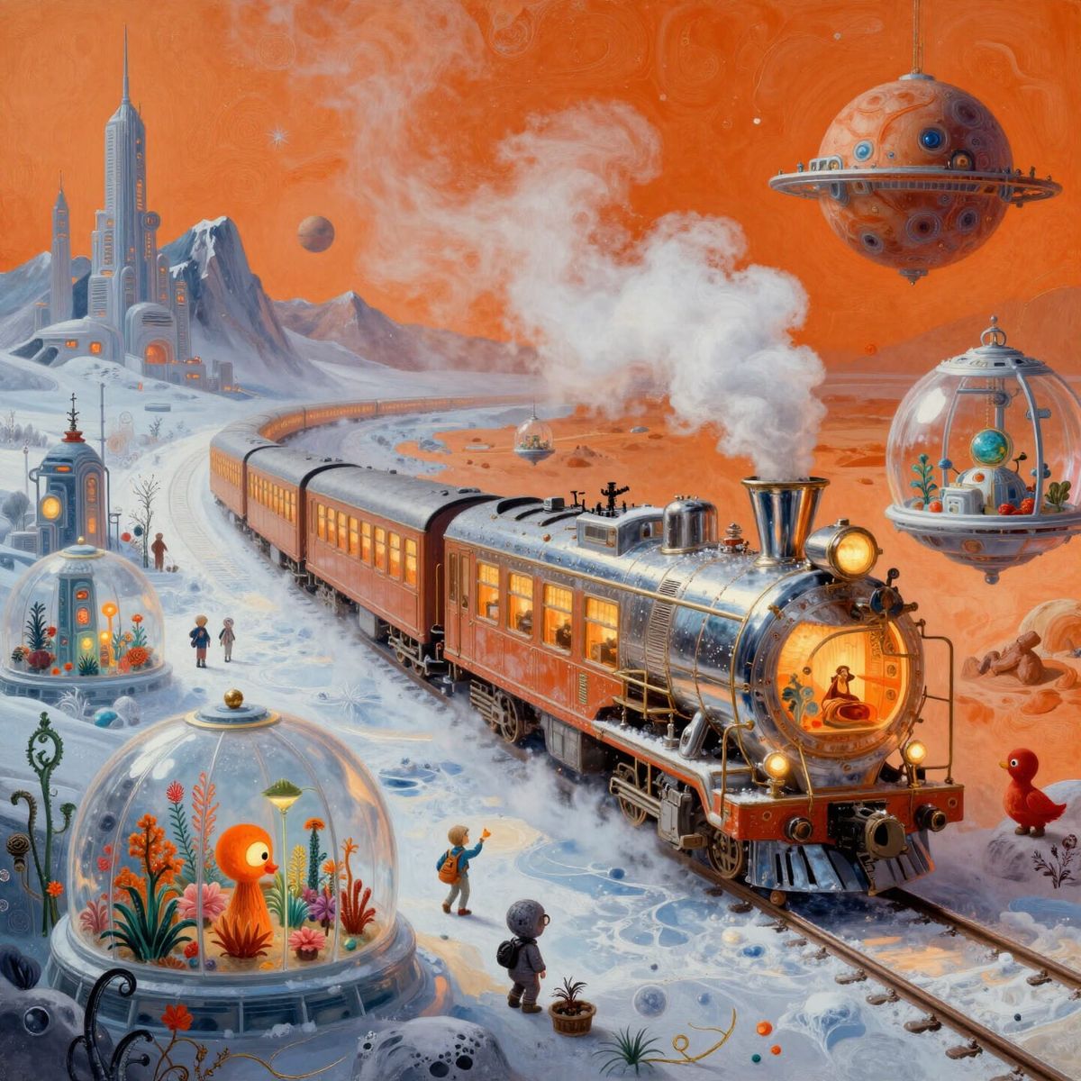 This image depicts a retro-futuristic train journey through a snowy Martian landscape. The dominant color is orange, with steam, frost, and glowing windows creating a magical winter travel scene.
