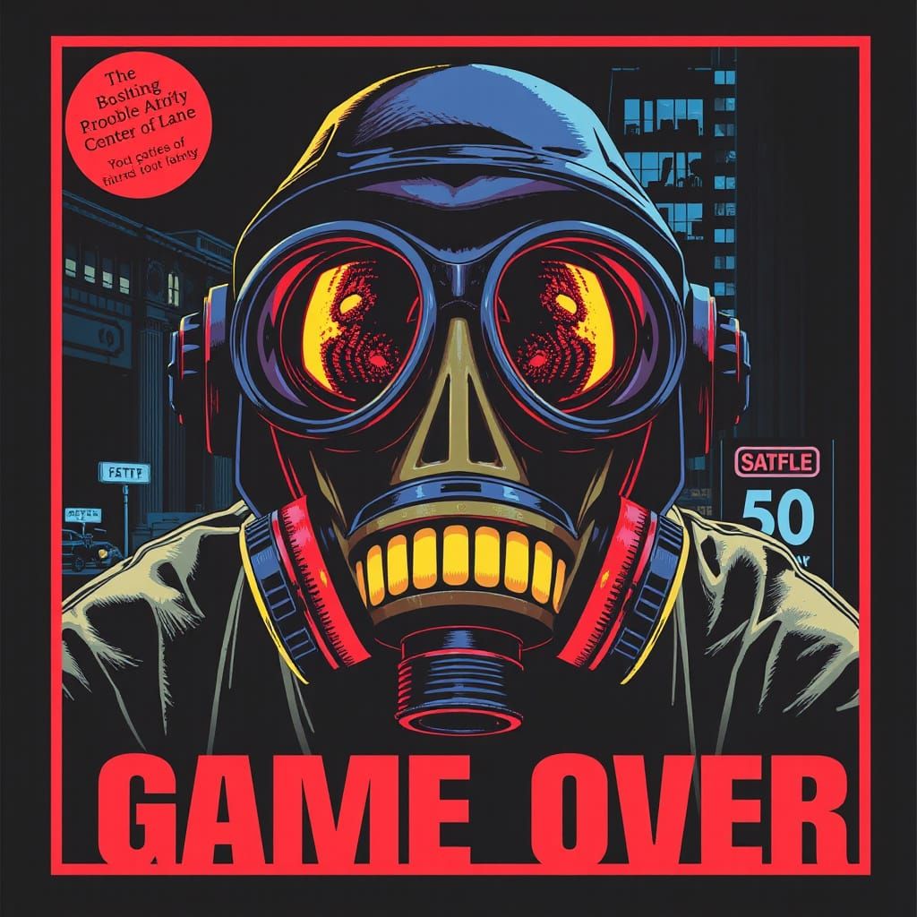 This image shows a retro science fiction album cover featuring a gas mask. The artwork evokes a dark, old-school horror aesthetic against a science fiction cityscape with bold text.