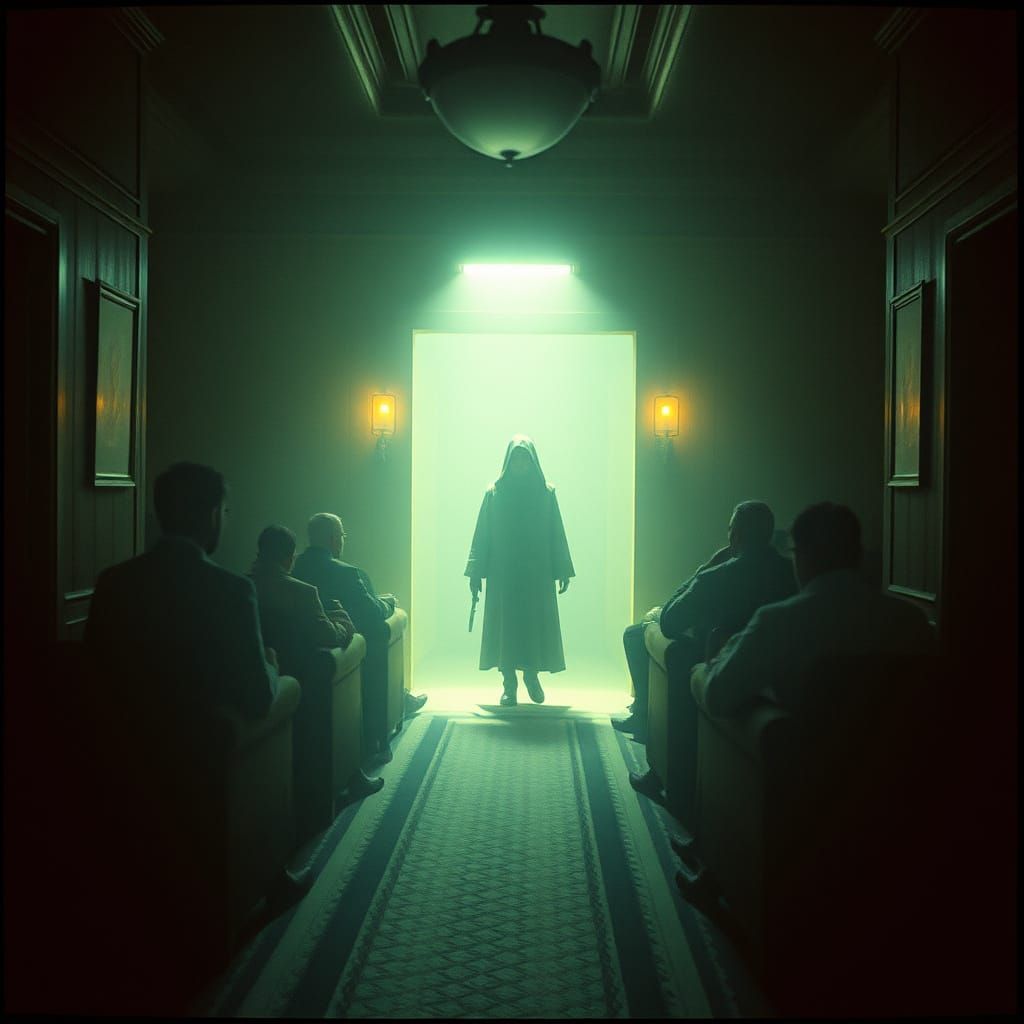 This image shows a cinematic film still with dramatic lighting and a vignette effect. The scene has been post-processed with film grain and color grading to enhance the atmospheric quality.