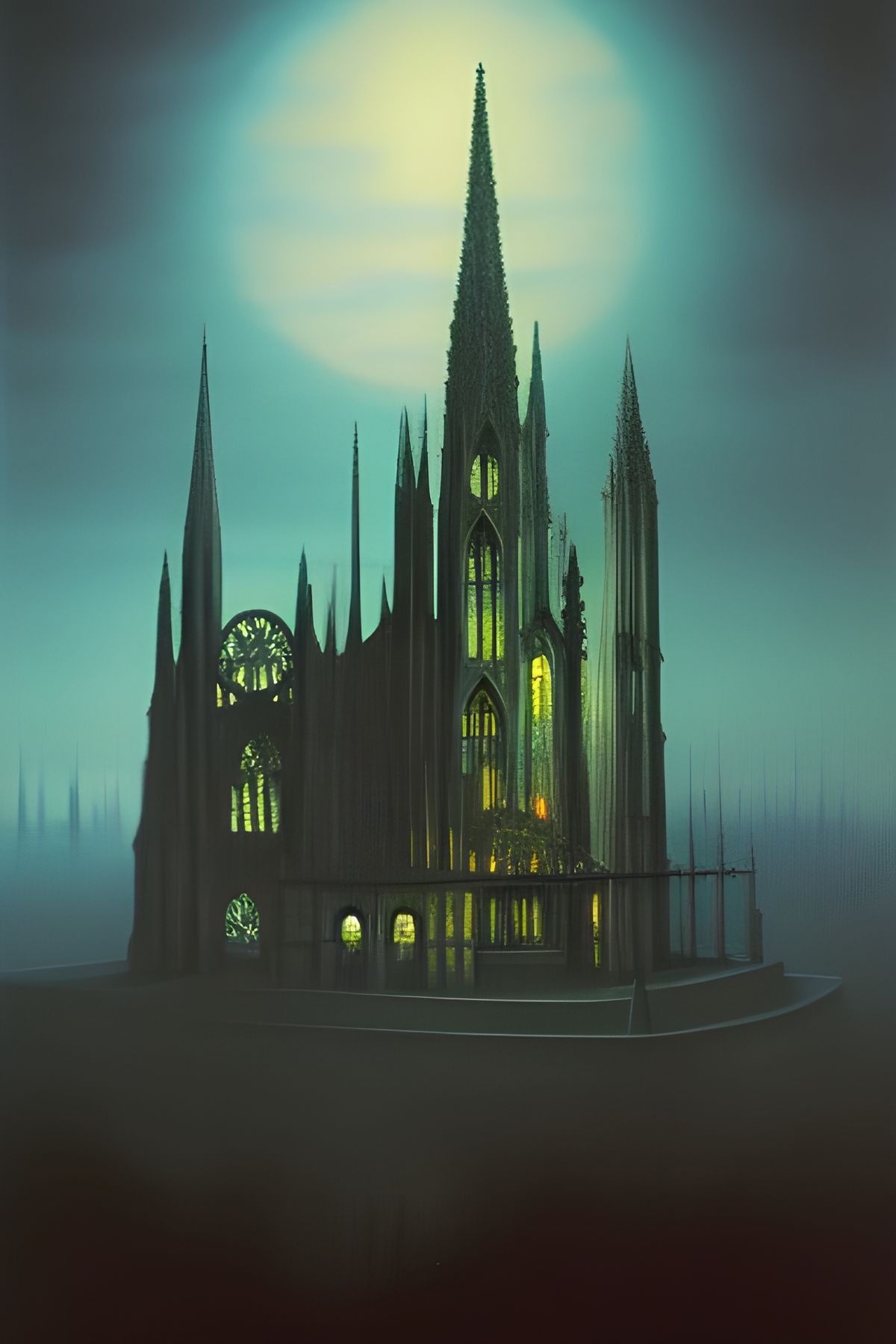 A gothic cathedral at twilight, rendered with meticulous detail. The image features volumetric lighting and blends renaissance painting techniques with dark fantasy elements, reminiscent of dark academia.