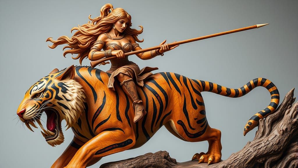 This image shows a determined huntress, crafted from intricately carved wood, riding a saber-toothed tiger. The artwork blends fantasy and realism with delicate painting highlights and elaborate patterns.
