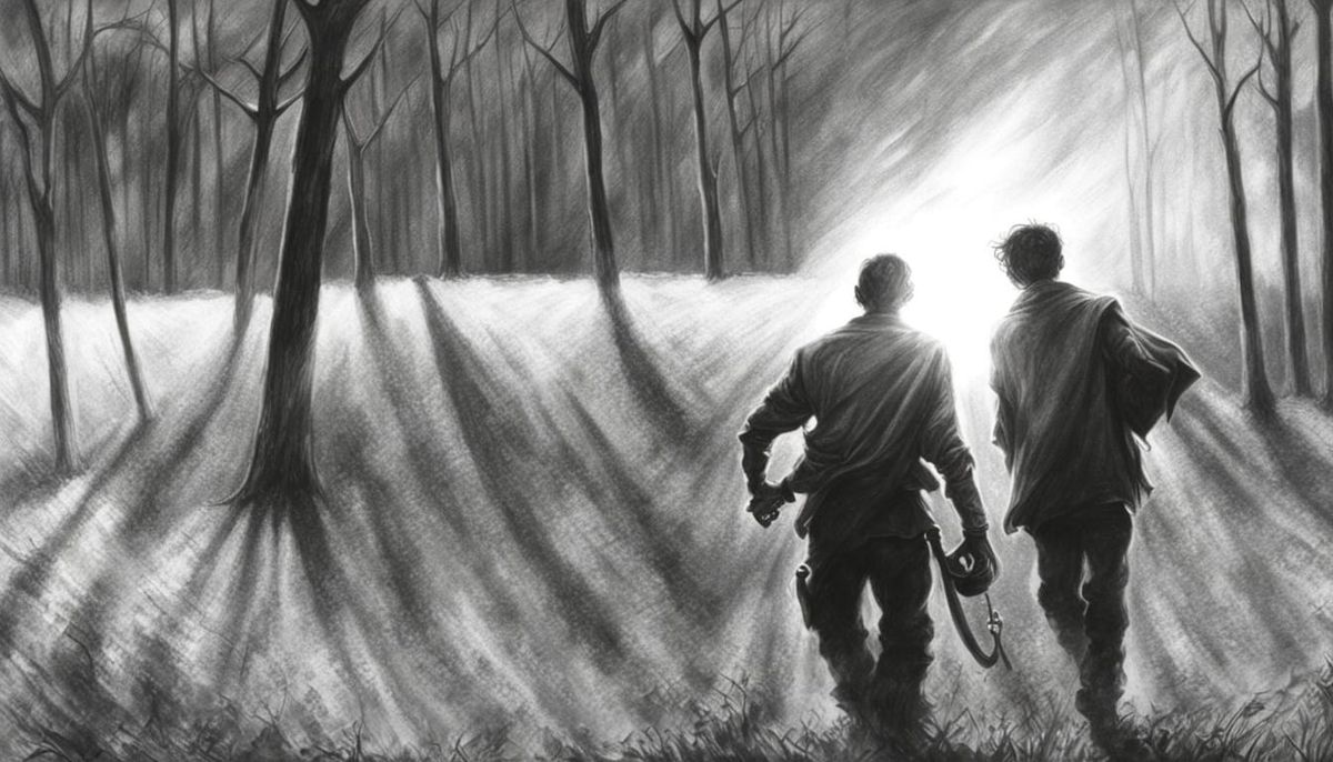 This image depicts a scene of horror with heavenly light shining upon it. The low-angle shot in charcoal style, with dark clouds and high contrast lighting, creates an eerie and ominous atmosphere.