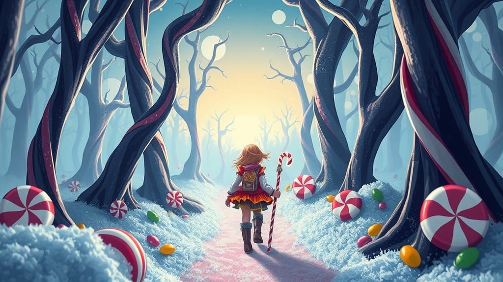 This image shows a young explorer in a licorice forest. Towering black licorice trees twist under a candy star sky. The ground is marshmallow fluff, with candy critters and jellybean pathways creating a whimsical scene.