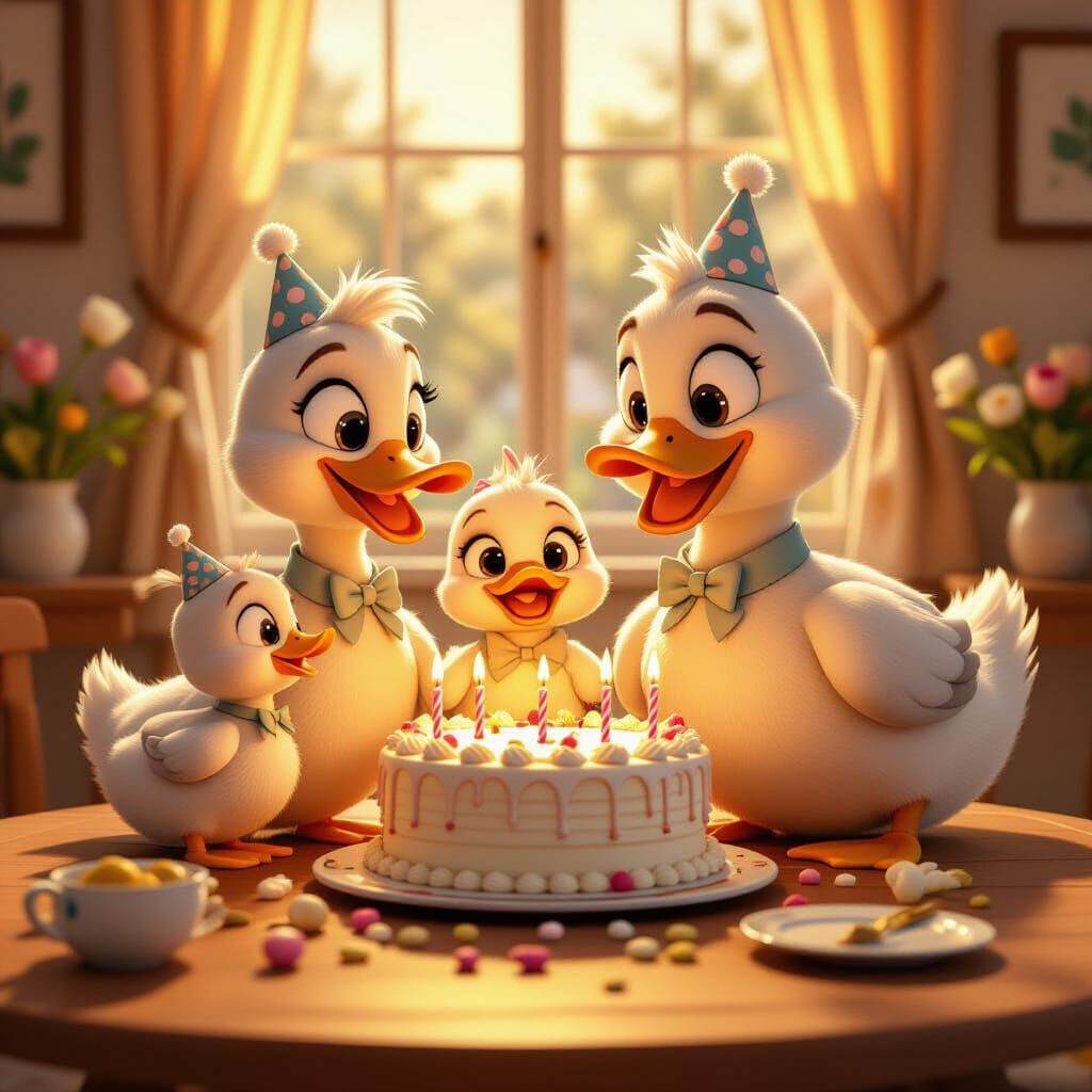 This image depicts a joyful duck family celebrating a birthday around a decorated cake. Warm lighting enhances the scene, rendered in a charming 3D animation style with vibrant colors and a focus on character warmth.