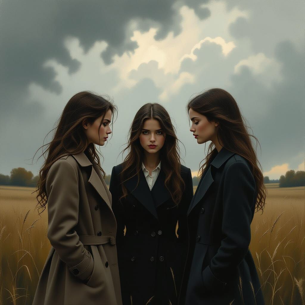 A dramatic image of three girls conspiring under a stormy sky. The composition evokes a sense of mystery, employing earthy tones and cinematic lighting to enhance the emotionally charged scene.